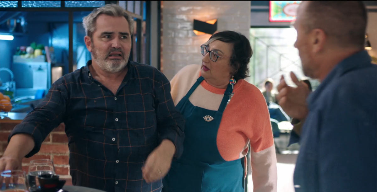 Bruno arrive et lance à Christelle, devant Sylvain, entre les fleurs et le prénom du défunt (oui, la personne morte s’appelle aussi Sylvain) : « Ça donne presque envie de mourir. Il manque juste la tombe. »